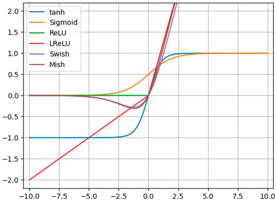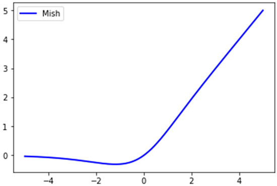 Mish function [40] is a novel self-regularized non-monotonic activation function. Its shape and properties are similar to those of Swish. It plays an important role in the performance and training dynamics of neural networks. The Mish activation function can be expressed as follows: