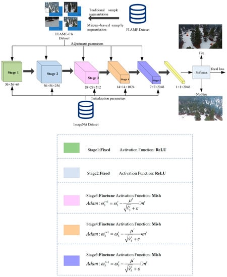 The idea of transfer learning was introduced to solve the problem of limited sample size of UAV forest fire images. In this study, the ResNet50 network trained on ImageNet dataset [31] was migrated to the experimental dataset of UAV forest fires. The ImageNet dataset contains about 1.2 million images in 1000 categories. Using the network model pre-trained on such a large dataset, it can be effectively migrated to classification tasks of various images [32]. The ResNet50 network was trained on the Imagenet dataset, taken as the preliminary training model, and the optimal configuration of the ResNet50 network was realized by fixing the convolution block of shallow feature extraction, fine-tuning the convolution block of deep feature extraction, and adjusting the Mish and Adam parameters, to complete feature extraction and recognition based on UAV forest fire images.