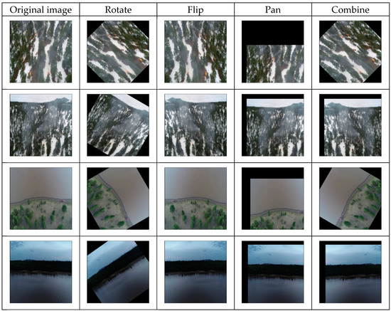 In this study, the traditional sample augmentation method was combined with the mixup-based sample augmentation method to expand the samples of the FLAME dataset, and a new forest fire dataset, FLAME-Cls, was obtained after the sample augmentation. Figure 6 and Figure 7 show the expansion effects of the traditional sample augmentation method and the mixup-based sample augmentation method, respectively.