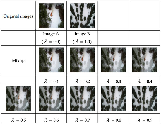 where and are the two random examples extracted from training sample data, and [0, 1]. follows a Beta distribution, namely . This mixup-based data enhancement method has the advantages of processing decision boundary blurring, providing smoother predictions, and enhancing the prediction ability of the model beyond the scope of training dataset. Figure 2 shows the process of mixup-based image sample augmentation. The experiment shows that when = 0.5, , the best data-fusion effect is achieved.