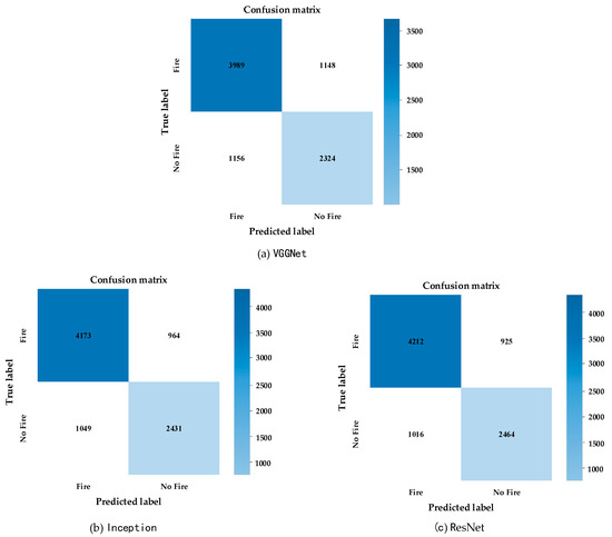 This research used VGG, Inception, and ResNet50 as the backbone network to test forest fire recognition rates. As shown in Table 7, compared with the other two structures, choosing ResNet50 with residual structure as the backbone network can to a certain extent alleviate the problem of gradient disappearance, which is beneficial for model training. ResNet50 replaces the fully connected layer in VGG with global average pooling in the final output, which greatly reduces the network parameters and the risk of overfitting. Figure 10 shows the comparison of confusion matrices for three different backbone network structures. It can be seen that ResNet50 achieved more accurate predictions than other methods.