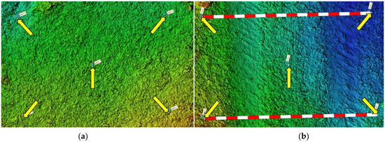 A set of sharp images which have a sufficient overlap is essential for obtaining accurate DEMs in the SfM process. Therefore, it is necessary to calculate the necessary minimum number of images for a recorded area. The developers of the software used for processing of image sets suggest 60% side and 80% forward overlap of the images [19]. The calculation of the smallest required number of images was based on the dimensions of the camera sensor, the focal length of the lenses, the height of the cameras above the terrain, and the overlap rate of the images [20]. The spacings between the neighboring images in both (x, y) directions were calculated according to the following formula: