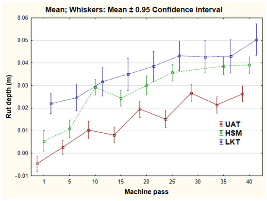 The average depths of ruts observed after the 40th pass fluctuated between 0.026 (UAT) and 0.050 m (LKT). Such shallow ruts occurred due to the high amount of coarse rock fragments in soil and low soil moisture. Another reason is the movement of empty skidders without a load. The depth of ruts can be used as an indicator of soil compaction [27]. Ruts with a depth of up to 10 cm reduce soil porosity by 7%. A methodology for evaluation of soil damage caused during timber skidding [28] considers ruts with a depth less than 7 cm as non-significant soil damage, and their occurrence is unlimited.