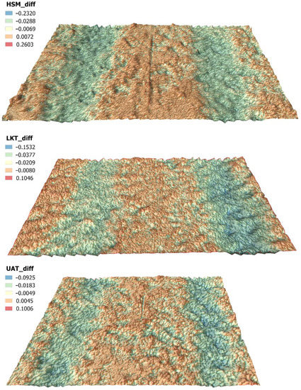 The final observed volume change, caused by the machine after 40 passes was 0.089 m3 for LKT, 0.038 m3 for HSM, and 0.021 m3 for UAT per 1 m of a track. The visualization of surface changes at individual plots after 40 passes of individual tractors derived as a difference between the rasters after the 40th pass and before passes for individual plots in the Raster Calculator module of the QGIS program is shown in Figure 7.