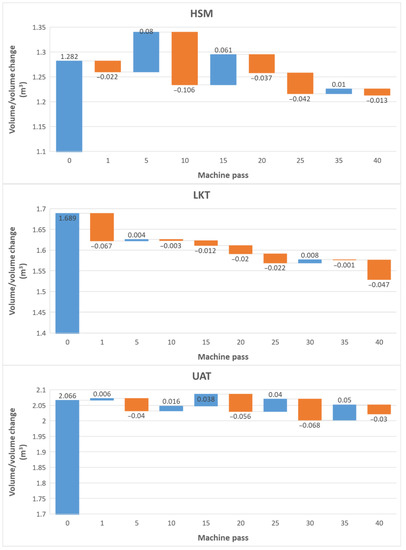 The greatest volume change was recorded in the case of LKT, which was 421% of the change under UAT. This was followed by HSM, under which the volume change was 182% of UAT. Volume changes between individual passes were usually negative, i.e., absolute values of volumes decreased after individual passes (Figure 8). At the HSM plot, volume changes were large and least balanced with irregular alternations of positive and negative values. This course resulted from the insufficient number of images and interpolation of gaps when creating rasters using the SfM process. At the LKT plot, the volume continually decreased after individual passes, and the changes were low and balanced, while the volume changes were positive only in two cases, after the 5th and 30th passes. At the UAT plot, the volume changes were low, and positive and negative values alternated. Negative changes were observed under even passes that were performed backwards down the hill. On the contrary, positive changes indicating the increase in volume were recorded after uneven passes performed forward and uphill. The only exception was the 5th pass. The volume changes corresponded with rut depths.