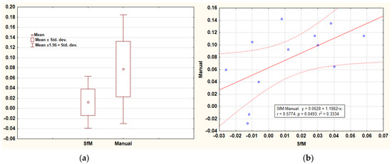 The regression and correlation analysis of volume changes (Δ) between the SfM and manual methods confirmed their significant relationship (Figure 9b). Subsequently, the differences between Δ changes derived using the two methods were calculated. The average difference between the volumes derived using manual and SfM methods was 0.0653 m3, which was significantly different from 0 (Table 10).