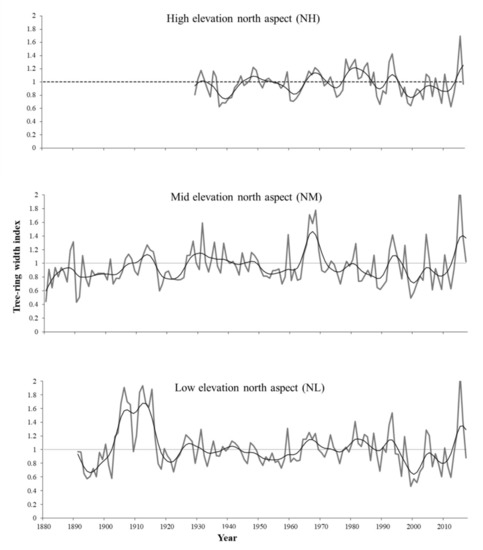 In high-elevation mountains, climatic change may affect more rapidly the population structure, the distribution, and the annual growth rates of tree species. In these areas, the radial growth of trees can also be subject to environmental gradients related to elevation [1]. In temperate environments, growth conditions in tree species can vary widely along altitudinal gradients, and these variations are recorded in tree rings [2,3,4]. Previous studies have found that the relationship between tree growth and climate frequently varies in response to elevation [5,6]. In some cases, the temperature is the most limiting factor of growth in subalpine and timberline zones [1,6,7], in other cases both temperature and precipitation affect ring width (RW), which is a measure of radial growth [8]. In contrast, the growth of tree species at lower elevations usually shows a significant and positive correlation with precipitation [9,10]. Nonetheless, forests and tree species do not always conform to these patterns; for instance, tree growth at mid-elevation (2270–2800 m.a.s.l.) and high-elevation (>3000 m.a.s.l.) sites in north and central Mexico (20–30° N) is mainly correlated with winter-spring and total regional precipitation, not temperature [11,12,13,14,15]. Additionally, in other montane forests located in subtropical and temperate geographic regions, different growth trends have been observed at low-, middle-, and high-elevation belts; both precipitation and temperature have been reported as highly correlated at different elevations [2,16]. Therefore, variations in tree radial growth along elevational gradients are mostly influenced by regional climate variability.
