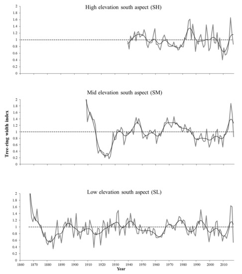 Trends in tree growth and their interrelations between rings and climate conditions vary widely among regions, elevations, and over time [2]. This research documents the variability in growth of Abies jaliscana in relation to elevation range and considers two aspects (north and south). Although some differences in the radial growth of A. jaliscana were found at each elevational belt, differences between tree ring parameters and elevation were not statistically significant. Even though in the north aspect there was a clear increase in mean ring-width in the site with the highest elevation (Table 2), this increase is not related to precipitation since this does not vary along the elevational gradient (Table 1). Therefore, we can infer that the increase in ring width at the high-elevation site may be related to less evapotranspiration due to a lower temperature that occurs at high elevations, and greater retention of moisture in the soil by having flatter reliefs (lesser slopes, Table 1) and deeper soils. The chronologies obtained (Figure 3 and Figure 4) are similar in length to those reported for other Abies species from the TMVB [13,20], however, a chronology from Abies guatemalensis (in all probability being A. hickelii the correct species) in the Sierra Norte de Oaxaca had a reported length of 206 years [21]. Other studies reported chronologies extended for 300 years in Abies guatemalensis from Los Cuchumatanes, Guatemala [40], and for 353 years in Abies concolor from San Pedro Mártir National Park, Baja California [41]. The shorter length of the chronologies observed in the TMVB could be explained by a high incidence of commercial and illegal logging since it is a region with greater anthropic pressure than other regions.