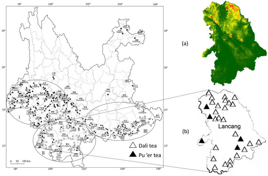 - Liao, S.; Li, L.; Lv, H.; Wu, W.; Wang, Z.; Kong, W.; Li, Z.; Ma, F.; Xu, L. Jinggu Dai and Yi Autonomous County Ancient (Wild) Tea Trees Resources; Yunnan Institute of Forest Inventory and Planning, Chinese Academy of Forestry Research Institute of Resource Insects: Pu’er, Yunnan, China, 2019. [Google Scholar]