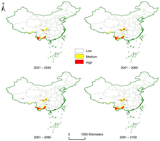 - Jiang, R.; Zou, M.; Qin, Y.; Tan, G.; Huang, S.; Quan, H.; Zhou, J.; Liao, H. Modeling of the Potential Geographical Distribution of Three Fritillaria Species Under Climate Change. Front. Plant Sci. 2022, 12, 749838. [Google Scholar] [CrossRef]