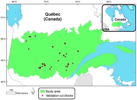 Location of the study area in Québec (Canada) and validation cut blocks (red stars).