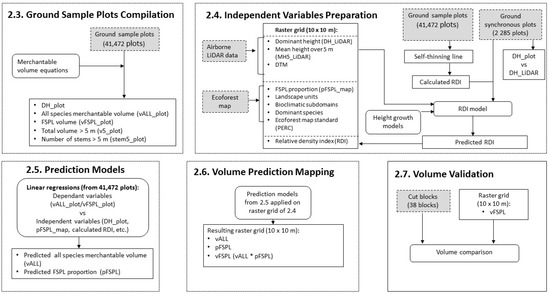 In Québec (Canada), several thousand 400 m2 ground sample plots have been measured since the 1960s and entirely cover the province’s managed forests. Most of this huge dataset has been acquired for volume and other forest attribute calculations. Sample plots are measured synchronously with the province’s ecoforest mapping process, which takes approximately a ten-year cycle to complete. In this context, this ground sample plot dataset can be potentially used to develop a general forest attribute parametric model for which independent variables can be subsequently linked to recent LiDAR metrics and ecoforest map attributes. Such models are advantageous, as they ensure that the ecological tendencies are taken into account and, once developed for an area, these models overcome ground sample plot measurement requirements such as positioning accuracy and synchronicity with LiDAR [17]. However, because of the frequent time gap between ground sample plot measurements and LiDAR acquisitions, no large-scale parametric models have yet been developed using LiDAR acquired independent of ground sample plot datasets to ultimately produce merchantable wood volume maps using LiDAR data.