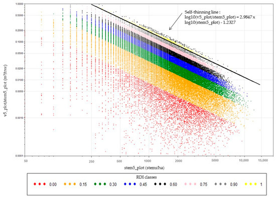 Second, with the self-thinning line, an RDI value was calculated for each synchronous ground plot. The calculated RDI was obtained by dividing the observed stem5_plot by the stem5_plot resulting from the self-thinning equation.