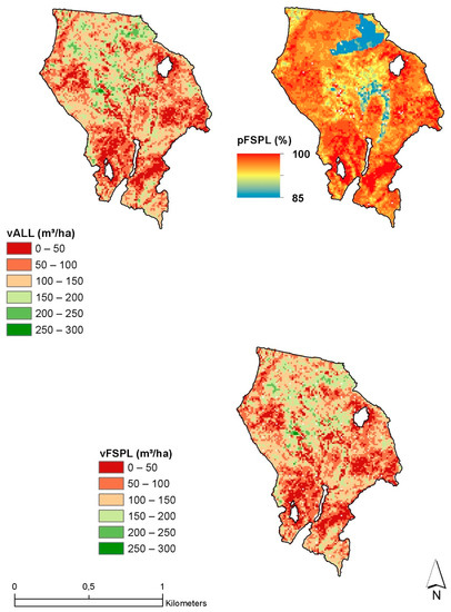 Figure 5 shows the comparison between vALL and vFSPL in the cut blocks. Most of the cut blocks are close to the 1:1 line. R², RSME, and the mean bias are, respectively, 82.25%, 13.7 m3/ha, and −4.09 m3/ha.