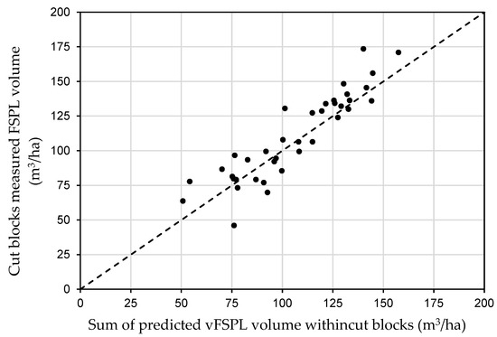 Measured FSPL volume compared to predicted volume values from models (vFSPL) within cut blocks.