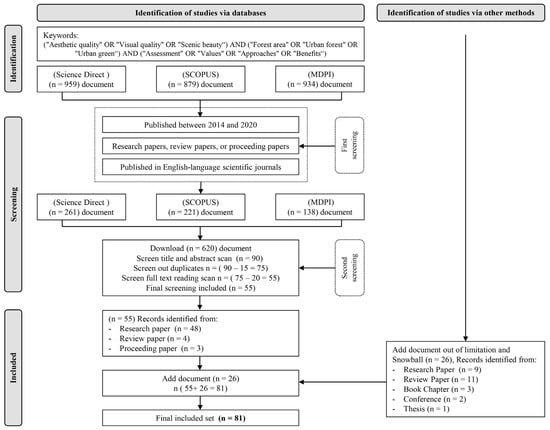 The selected keywords for the search were divided into three major components: aesthetics, urban forests, and investigations. Previous research refers to the landscape aesthetic components of the environment using the terms “scenic beauty”, “aesthetic quality”, “landscape quality”, and “visual quality” [10,21]. “Scenic beauty” can be defined as visual aesthetic quality for landscape assessment, making scenic beauty and visual quality the main components of landscape aesthetics [2,3,10,22]. Therefore, aesthetic components were included in the systematic review by searching for the keywords “aesthetic quality”, “visual quality”, and “scenic beauty”. In the urban-forest component, the “forest” term is the most common, but we specifically chose to focus on urban forests because they directly impact human life. Although research on urban areas frequently uses the phrases “urban forests” and “green urban areas”, we included the keyword “forest area” in the search to provide more detailed information [14]. Urban-forest components were included in the systematic review using the keywords “forest area”, “urban forest”, and “urban green”. The investigation component attempted to add clarity to the variety of topics covered by searching for assessments, benefits, approaches, and values. Ultimately, the systematic review was based on a search using the keywords: “aesthetic quality” OR “visual quality” OR “scenic beauty” AND “forest area” OR “urban forest” OR “urban green” AND “assessment” OR “values” OR “approaches” OR “benefits”.