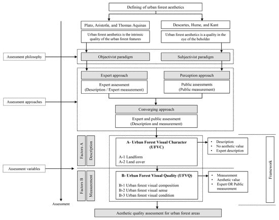 Less attention towards the aesthetic assessment of urban forests could jeopardize their existence. Decision makers often face difficulties in implementing measurement standards in urban-forest aesthetic assessments, which could also provide strong justifications for urban green space preservation. The aim of this study is to conduct a systematic literature review on the topic of assessing the aesthetic quality of landscapes as a model for urban forests to understand and create a framework of aesthetic quality assessment for urban forest areas. In this regard, defining the aesthetics of urban forests and understanding their benefits are the primary purposes and arguments for studying their aesthetic assessment. In order to have an adequate understanding of the process of assessing the aesthetic quality of urban forests and create an integrated framework, it is essential to have knowledge of the philosophy and assessment background, assessment approaches, and assessment variables of landscape aesthetic assessment. Therefore, the findings are divided into the following categories presented in the homonymous sections: