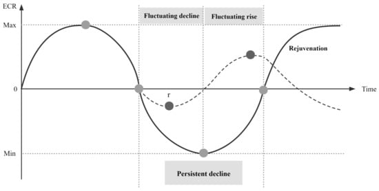 This paper established a theoretical model referring to Yin et al. (Figure 1) based on the above analysis. Our model only focuses on the decline and rejuvenation phases and distinguishes the decline phase further. In this model, efficiency change rate (ECR) is taken as the main index to judge the life cycle stage. Specifically, ECR > 0 represents continuous efficiency growth. When ECR reaches the maximum value, efficiency grows fastest, and tourism destinations are usually in the development phase of their life cycle. When ECR < 0, the efficiency value decreases, which is judged as a declining stage in this study. r is the duration of ECR < 0. Due to the cyclical fluctuations in tourism efficiency generally, the decline phase was divided into fluctuating decline and persistent decline. Fluctuating decline is followed by a phase of fluctuating rise. Only after the continuous decline stage can tourism destinations have the chance to enter the rejuvenation phase. Furthermore, it should be emphasized that the curves in Figure 1 are only a stereotyped assumption, while the efficiency variation of tourism destinations in the actual situation is non-regular.