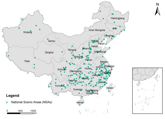 NSAs are the spatial areas with concentrated scenic resources and wonderful natural environment that are available for sightseeing, recreation and scientific research [60]. In 1982, the Chinese government established the management system for National Scenic Areas. Until 2022, a total of nine batches with 244 sites were selected and they are distributed in 32 provincial-level administrative regions in China (Figure 2). NSAs are the main body of China’s “World Natural and Cultural Heritage”, representing China’s most essential natural and cultural landscape [61]. In the Classification Standard of National Scenic Areas(CJJ/T121-2008), NSAs are divided into Mountain, Cave, River & Waterfall, Coast, Wetland & Lake, Special landform, Historic heritage and Human landscape and Folk custom, etc. As most NSAs contain rich forest resources, Forest is not classified as a separate category. However, there is no denying that forest landscape is one of the most significant landscape types in NSAs.