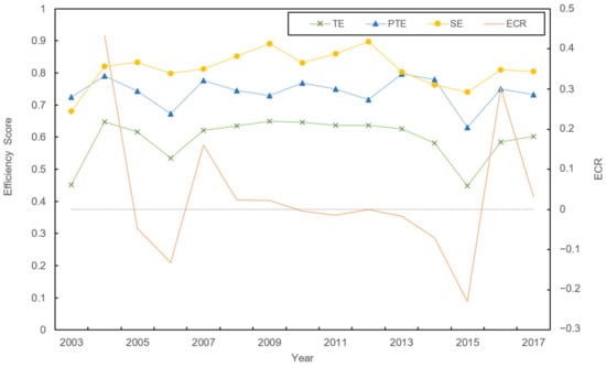 DEA-SOLVER Pro software was used to calculate the tourism efficiency of NSAs in China from 2003 to 2017 and further decomposed it into PTE and SE (Table A1). From the overall perspective of China, by observing the trend in Figure 3, the TE of NSAs is in the state of “fluctuation—stationary—fluctuation”. Comprehensive efficiency experienced a sharp rise and declined from 2004 to 2006 and leveled off from 2007 to 2013, remaining at about 0.63. There was a noticeable decline process from 2013 to 2015, the degree of reduction was more than 20%, but it recovered rapidly from 0.4486 to 0.5843 in 2016. TE reached the average level in the stable period in 2017, although not at the highest level. The ECR falls below 0 three times during the whole process, the second time (2011) is only a fluctuating decline with minimal values, and the third time (2013–2015) is a very significant continuous decline process with stronger intensity than the first time (2005–2006). The average annual growth rate of TE was 3.26%, which was in an overall upward trend, but the growth rate was relatively low. However, the annual tourism efficiency is below 0.7, far from the effective production frontier. This indicated that tourism destinations in China generally had input redundancy or output insufficiency, which need to be adjusted to form effective allocation.