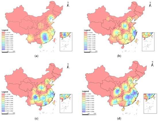 Evolution trend of NSAs’ tourism efficiency in China from 2003 to 2017. (a) 2003; (b) 2008; (c) 2013; (d) 2017.