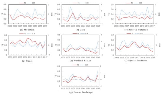 TE values and ECR of each type in NSA from 2003 to 2017 were drawn as a line chart (Figure 5). The overall trend is consistent for most types of NSAs, but there are also exceptions. For instance, all types of efficiency gains were positive except for the continuous decline of Special Landform from 2016 to 2017. Furthermore, from 2003 to 2004, the efficiency of most types of NSA showed a downward trend, and the efficiency of Wetlands and Lakes even decreased from 0.2685 to 0.1415. However, the efficiency of the Human landscape and Coast increased slightly. The above results indicate that different tourism destinations face diverse development opportunities even in the same environment.