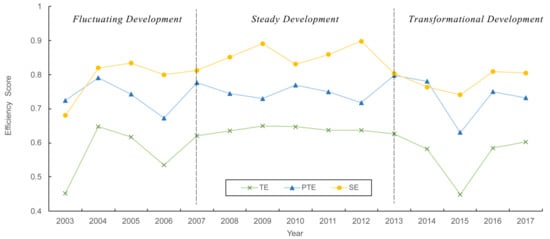 From the trajectories of the three types of efficiency curves, it can be seen that the change in TE from 2003 to 2007 is mainly driven by SE. The period of 2008–2013 was jointly promoted by PTE and SE. From 2014 to 2017, the driving effect of PTE was more significant, indicating that the efficient evolution of China’s mass tourism destination during the study period is characterized by a shift from technology-driven to dual scale-technology-driven and then to technology-driven.