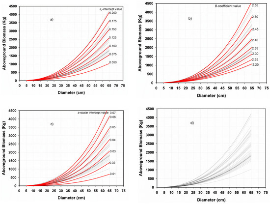 Tree aboveground biomass equations for all 41 North American tree species reported by Ter Mikaelian and Korzukhin [15] overlapped with allometric equations that assume: (a) a variable a-scalar intercept value and a constant B-scalar coefficient value of 2.38; (b) a constant a-scalar intercept value and a changing B-scalar coefficient value; (c) a variable a-scalar intercept value and a constant B-scalar coefficient value of the MWBE model of 2.67; and (d) a variable a-scalar intercept value and a variable B-scalar coefficient value. Red lines depict models with specific assumptions and grey lines the aboveground biomass equations reported by Ter Mikaelian and Korzukhin [15] for North American forests.