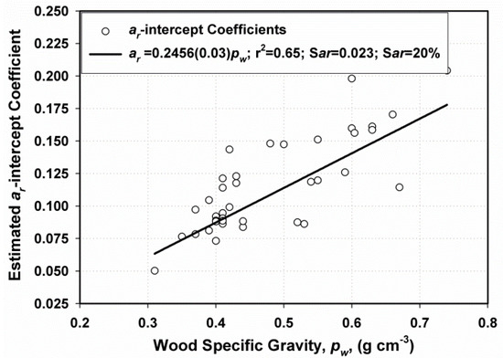 Next ar was plotted as a function of ρw and a linear equation fitted to this relationship (Figure 2). The equation was forced to start from the origin in such a way that ar = Cρw with the slope describing the C proportionality constant, to be consistent with both Equations (1) and (2). The bole wood specific gravity data was collected from internet sources.