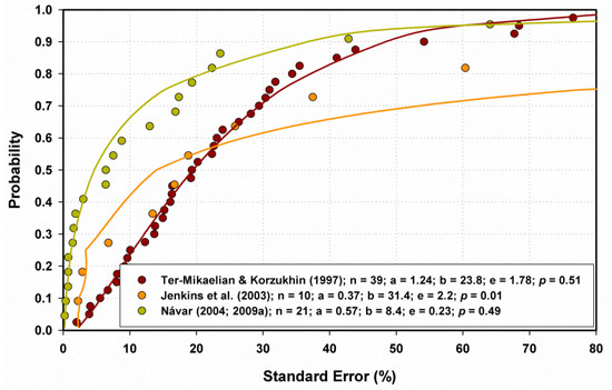 That is, only in 4 out of 21 (19%); in 4 out of 10 (40%); and in 19 out of 39 (49%); the standard error is larger than 20% for the compiled M case studies, respectively. For all Návar’s [12,14] 21 allometric equations, the standard deviation values > 40% could be observed for only the species Pinus arizonica and Acacia spp. but most of the error was found in trees with D > 30 cm. An example of the application of the MNR model is depicted in Figure 4 in conjunction with the Jenkin’s et al. [23] M equations for ten clusters of North American tree species. For all ten Jenkins’ et al. [23] equations standard deviation figures > 37% were observed in cedar/larch; true fir/hemlock; and woodland (juniper/oak/mesquite) species. The first two clusters of species recorded most deviations in trees with D > 60 cm. The MNR model bias projected M data for the woodland tree species. For the Ter-Mikaelian and Korzukhin’s [15] 39 biomass equations, the proposed model deviates (e.g., Sx(%) < 30%) in 29 tree species.