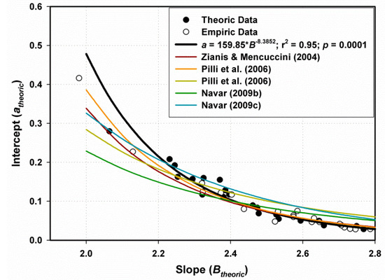 Two issues arise when contrasting the MC and the MWBE models: (i) Is the B-scalar a constant or variable coefficient? (ii) Is the a-intercept a constant or variable coefficient? Most conventional equations report different a-intercept and β-scalar coefficients. In part this variability has been attributed to sample size, the size distribution of trees in the sample, among others. Zianis and Mencuccini [3], Návar [6] and Paz-Pellat et al. [21] modeled and Genet et al. [22] found evidence in Fagus plantations the B-scalar coefficient varies with age of trees. Návar [6] derived mathematically the a-intercept and found it varies as a function of the shape of the tree and the wood specific gravity, ρ, value. Assuming ρ remains constant from young to mature trees, the shape of tree boles appears to control the C coefficient as well as the B-scalar coefficient. However, further research is required to associate these coefficients to tree forms and, as a consequence, to improve understanding on tree allometry. Paz-Pellat et al. [21] recently advanced how to mathematically derive the scalar coefficients using generalized tree allometric concepts that are in part consistent with those derived earlier [2,4,6,22] but the biological dependency of these coefficients has been quite elusive for some time.