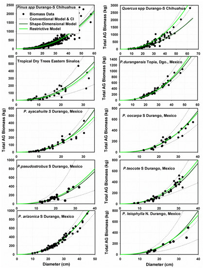 The development and application of allometric equations is the standard methodology for tree, stand, regional, and World M assessments [6,9,10,11]. Tree M equations are classified according to: (i) the spatial scale of interest into local, regional, national or World equations and (b) the parameter estimation method as empirical, semi-empirical and theoretical models [6]. These two kinds of model classifications can be applied at the scale of single species or complete forests. Many examples of allometric equations for single tree species had been developed and reported in the scientific literature, e.g., [12,13,14]. Typical allometric equations developed for complete forests had been also reported [1,11].