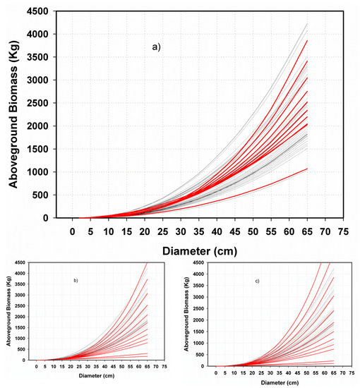 Testing the performance of the (a) shape dimensional model proposed in this report as well as (b,c) two forms of Paz-Pellat. [21] models, respectively. The last two models assume the β-scalar coefficient has been correctly estimated. Red lines represent the models and grey lines the aboveground biomass equations reported by Ter Mikaelian and Korzukhin [15].