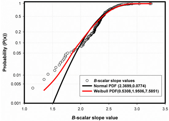 where ah is the intercept and β = H* is the slope of Equation (9), with 0 < H* ≤ 1; H* ≈ ½.