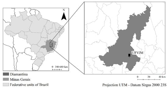 Location of the study site, JK Campus of the Universidade Federal dos Vales do Jequitinhonha and Mucuri (UFVJM) in Diamantina, Minas Gerais, Brazil.