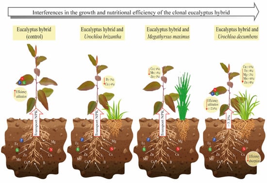 Competition with grasses restricted the availability of nutrients for the eucalyptus clonal hybrid [63,64], reducing the efficiency of NPK utilization by this plant. Lower nitrogen uptake and utilization affect cell wall synthesis and organization, causing adaptations in the root system [65,66]. Decreases in phosphorus uptake reduce cell elongation and stop primary root growth [67], while lower potassium uptake causes changes in the regulation of root growth [68]. Thus, competition between eucalyptus and grasses limits nutrient absorption, transport, and use, which generates physiological changes and, consequently, reductions in growth parameters [19,69,70].