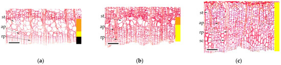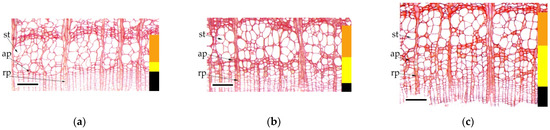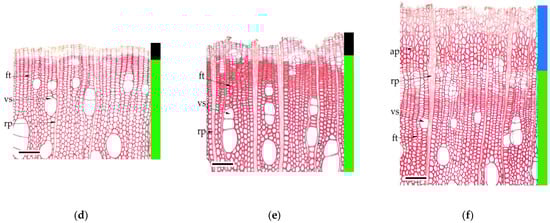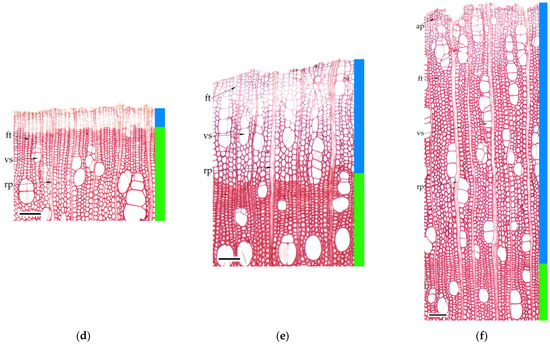 Transverse sections of phloem (a–c) and xylem (d–f) 35 cm above girdle (AG35) of girdled trees. (a,d) 10 days after girdling (10DAG); (b,e) 20 days after girdling (20DAG); (c,f) 30 days after girdling (30DAG). Colors show the following tissue layers. Green: xylem formed before the experiment; blue: xylem formed after the experiment; black: cambial zone; yellow: late phloem; orange: early phloem. The letters in the figures are vs: vessels; ft: fibrous tracheids; rp: ray parenchyma; ap: axial parenchyma; st: sieve tubes. Scale bar is 100 µm.