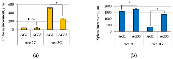 Width of phloem increment (a) and xylem increment (b), formed after the girdling. Representative values are given for one control (tree 2C) and one girdled tree (tree 3G). Characteristics for all trees can be found in the Supplementary Materials, Figure S1. The data in the diagrams are presented as M ± SD. Asterisks mark significant differences between groups (* p < 0.05), n.s.—no differences.