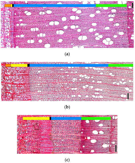 Structure of trunk conducting tissues at the end of the growing season: (a) control tree; (b) girdled tree, AG35 level; (c) girdled tree, AG1 level. Colors show the following tissue layers: Green: xylem formed before the experiment; blue: xylem formed after the experiment; black: cambial zone: yellow: late phloem; orange: early phloem. Scale bar is 100 µm.