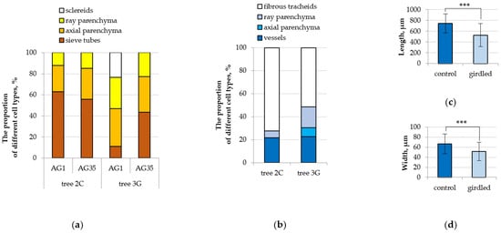 Anatomical characteristics of conducting tissues: (a) the proportion of different cell types in late phloem; (b) the proportion of different cell types in xylem in AG35 level; (c) length of vessel elements in AG35 level; (d) width of vessel elements in AG35 level. For (a,b), representative values are given for one control (tree 2C) and one girdled tree (tree 3G). Characteristics of all trees are provided in the Supplementary Materials, Figure S2. The data in the diagrams are presented as M ± SD. Asterisks mark significant differences between groups (*** p < 0.001), n.s.—no differences.