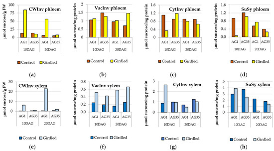 Girdled trees at 10DAG and 20DAG showed very high CWInv activity in the AG1 level on both the phloem and xylem sides. The cytoplasmic enzyme activity (CytInv, SuSy) at 10DAG was lower in phloem and higher in xylem in the AG1 level, compared to both control trees and tissues in the AG35 level of the girdled trees. At 20DAG, the activity of sucrose-degrading enzymes localized in cytoplasm did not differ from the control trees in both levels, except for SuSy in the xylem of the AG1 level. The VacInv activity in both phloem and xylem was low at both sampling dates. However, in the xylem at both levels, the VacInv activity was higher in the girdled trees compared to with the xylem of the control trees (Figure 6).