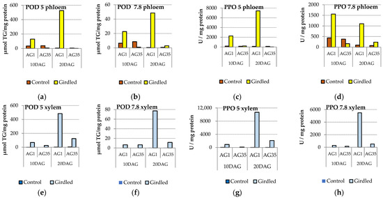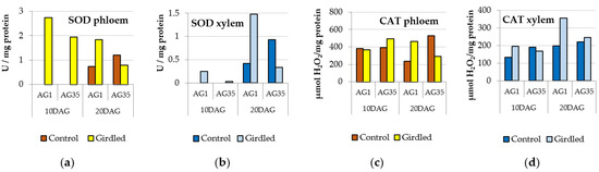 At 10DAG, SOD activity was not detected in the control trees but was quite high in both levels in the phloem of the girdled trees. The enzyme activity in the xylem of the girdled trees was considerably lower than in the phloem. In both tissues, the SOD activity was higher in the AG1 level compared with the AG35 level. At 20DAG, SOD activity was detected in both the phloem and xylem of both groups of trees. However, it was higher in the AG1 level in both tissues in the girdled trees, while in the AG35 level in the girdled trees, the SOD activity was lower compared with the control trees (Figure 7a,b).