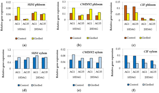On both sampling dates, the SUS expression was higher on the xylem side than on the phloem side. There was no noticeable difference in SUS gene expression in control and girdled tree tissues, except for SUS1 expression in the AG1 level at 10DAG (Figure 9a,d; Supplementary Materials, Figure S3). In contrast, the expression of genes encoding CWInv was higher on the phloem side than on the xylem side in all selection terms. In both tissues, the CWINV expression was slightly higher in the girdled trees than in the control trees at both sampling dates (Figure 9b,e; Supplementary Materials, Figure S3). Considerable differences between the control and girdled trees were detected in the expression levels of the genes encoding the protein inhibitor of CWInv activity (CIF). In the trunk tissues of the girdled trees, its expression was 2 times lower at both sampling dates (Figure 9c,f).
