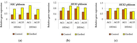 Relative gene expression of SUC (a), HEX1 (b), and HEX2 (c) genes in the phloem of control and girdled trees.
