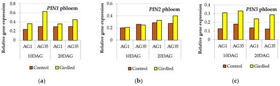 Relative gene expression of PIN1 (a), PIN2 (b), and PIN3 (c) genes in the phloem of control and girdled trees.