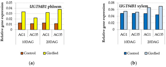 Relative gene expression of UGT84B1 gene in the phloem (a) and xylem (b) of control and girdled trees.
