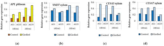 Genes encoding sucrose (SUC) and hexose transporters (HEX1 and HEX2) showed higher activity on the phloem side than on the xylem side. At both sampling dates, the expression of all the genes we studied was higher in the trunk tissues of the girdled trees than in the control trees (Figure 10; Supplementary Materials, Figure S4).