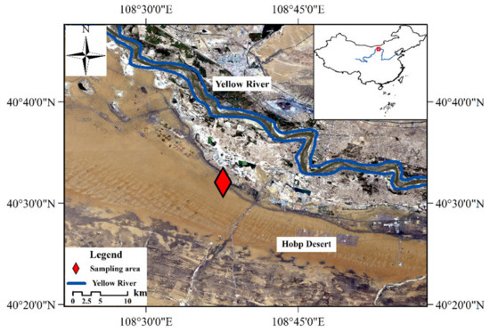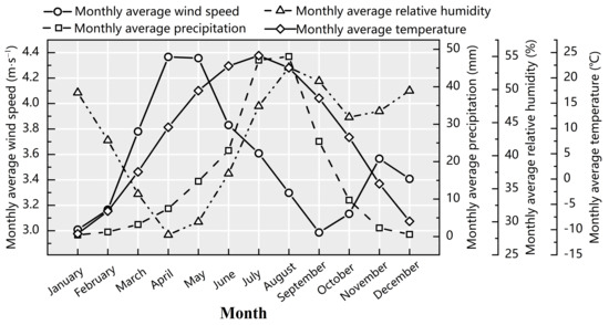 The study area is located in the northern part of the Hobq Desert in northern China (39°22′22′′~40°52′47′′ N, 106°55′16′′~109°16′08′′ E) (Figure 1). This is a typical temperate continental dry monsoon climate. The average annual temperature is 7.8 °C showing a gradual upward trend in recent years. The average annual precipitation is 188.4 mm, of which about 70% is between July and September. The average annual evaporation is 3155.95 mm. The study area has a high average wind speed and dry climate in spring throughout the year. Mean monthly precipitation, mean monthly temperature, and mean monthly relative humidity also reach their maximum between July and August (Figure 2). The winter and spring seasons in the region are characterized by dry weather and high wind and aeolian activity. Wind erosion causes loss of soil particles, which is a major cause of soil impoverishment. The original landforms in the study area are mobile sand dunes and moving sandy land, and the dunes are mainly barchan dunes and barchan dunes chains, which are more mobile and move faster. Sand-fixing artificial vegetation have been established over the years to mitigate wind and sand damage to towns and industrial parks as well as to the Yellow River basin.