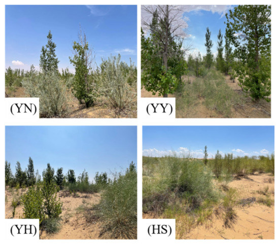 According to the records of the local forestry department. Artificial sand-fixing vegetation in the study area was established in 2000. The number of plant species is planted in a 1:1 ratio in mixed forests. We surveyed the field in August 2021. In this study, we selected fixed sandy areas that had been established with mixed vegetations of Populus alba var. pyramidalis × Caragana korshinskii (YN), Populus alba var. pyramidalis × Hedysarum mongdicum (YY), Populus alba var. pyramidalis × Hedysarum scoparium (YH), and Hedysarum scoparium × Salix cheilophila (HS) as the experimental group, and bare sand areas as the control group (LS). Classical survey methods were used to investigate vegetation features. At each site, three 50 × 50 m areas with five 1 m × 1 m subplots evenly distributed were selected for the survey. All sandy areas were under the same environmental conditions before the establishment of artificial sand-fixing vegetation. These vegetation types represented all habitat types in the area, and the area of each vegetation configuration pattern was large enough to have similar external environmental factors such as slope and elevation. Table 1 shows the base case of the five vegetation habitats.