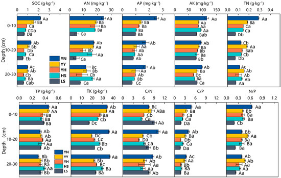 Distribution of soil nutrients. Note: Different uppercase letters indicate significant differ-ences (p < 0.05) between different mixed vegetation types on each soil layer, and different lowercase letters indicate significant differences (p < 0.05, Duncan’s test) between different soil layers under the same mixed vegetation type. Abbreviations: soil organic carbon (SOC), total phosphorus (TP), total potassium (TK), total nitrogen (TN), alkaline hydrolysis nitrogen (AN), available phosphorus (AP), available potassium (AK), carbon/nitrogen ratio (C/N), carbon/phosphorus ratio (C/P), nitrogen/phosphorus ratio (N/P). YN, YY, YH and HS represent P. alba var. pyramidalis × C. korshinskii, P. alba var. pyramidalis × H. mongdicum, P. alba var. pyramidalis × H. scoparium, and H. scoparium × S. cheilophila mixed vegetation types, respectively. LS represents mobile sandy.